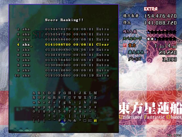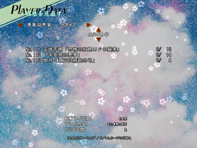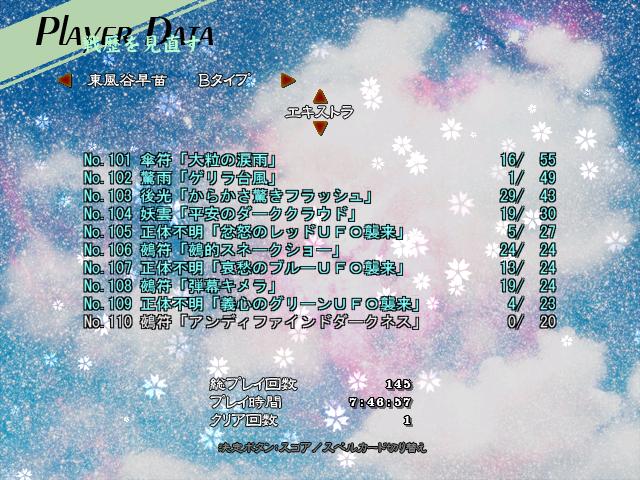 ■←早苗B 1,4億 残0ボム2 最大得点29,220 ようやくぬえを退治完了。 こんな俺でも星蓮船発売から1週間内でExクリア出来たなんてね。 それにしてもクリアしておいてスコアランキング4位かwwww 今回のクリアボーナスは過去作と比べて極めて価値が薄いようで、 いかに速攻でスペル取得するか、道中のUFO配分を考えるかが大事になるようですね。 今回のExボスのスペルは、簡単なものは初見でも取得出来るほど簡単。 特に前半。 逆に難関スペルは本当にカオス。機体によってはひたすら苦行ではないか。 虹色UFO襲来とか、あれはどうしたらいいんだろう。。。 グリーンUFO襲来も早苗Bですらパワー足りなかったら運ゲーっぽい。 アンディファインドダークネスは、 こいしちゃんの無意識の遺伝子と同じように耐久した方が得策と思われる。 今回の耐久は1枚でしたね。平安京の悪夢。 このスペルは取得出来そうで出来ない。 完全パターンみたいなので練習次第で安定しそうだけど、3段階目が無理。 気づいたら上に追い詰められてるし、弾の密度が上がってるし酷い。 ボムが無くて避けてたら取得ペースで残り0秒で被弾ということもあったし。 耐久で10回以上留まってるなんて酷い^^; ラストスペルの源三位頼政の弓は気合ですかね。 蓬莱人形、ミシャグジさまよりかは難しいと感じた。 発狂は結構大変。弾速と弾密度が凄いことになってる。 そんなわけでラストスペル4回目を経てクリア。自分にお疲れ様ですよ。 これで心置きなく明日の旅行に行けます^^; PR |