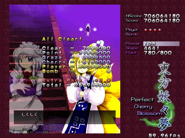 ■←咲夜B 7億 桜点61万 残4ボム0 とりあえず、7億という一区切りはつけられた。 本当は8億まで行きたいけど^^; 藍通常2でランダム弾が詰まって被弾。 アルティメットブディスト誤って早期撃破。 狐狗狸さんのラストチキンボム。 藍通常1~3はもっと前に出たほうが稼げるっぽいね。 PR |