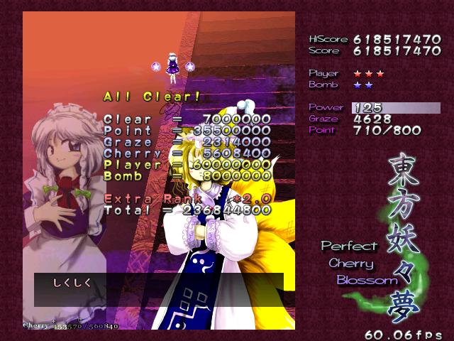 ■ 時符。 時符なら6億いけると公言してやってみたら、4.4億で全然そんなことなかった と思いきや、もう一度やったらうっかり6.1億。 いずれも飯綱の安地作成失敗。初見での安地は一体何だったのだろう。 (霊撃したので取得はしてない。) やはり時符は使いやすい。 でも、十二神将は取得出来そうでまだ一度も取得経験無し。 狐狗狸さんはダメだ。弾のスキマを抜けるのが怖すぎる。 おそらく耐久スペルの中で一番苦手。(こいしの嫌われ者はやった事無し) PR |