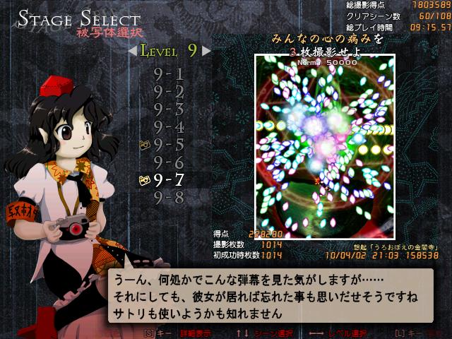 やはりトラウマ弾幕を出してきたか。 うろ覚えだからって本家より鬼畜とか・・・。 うろ覚え金閣寺だけで3時間はかかった。まさか1000枚越えするとは・・・。 左手が痛い。特に親指('A`) Lv8までは全撮影完了。とりあえず飯食おう。 |