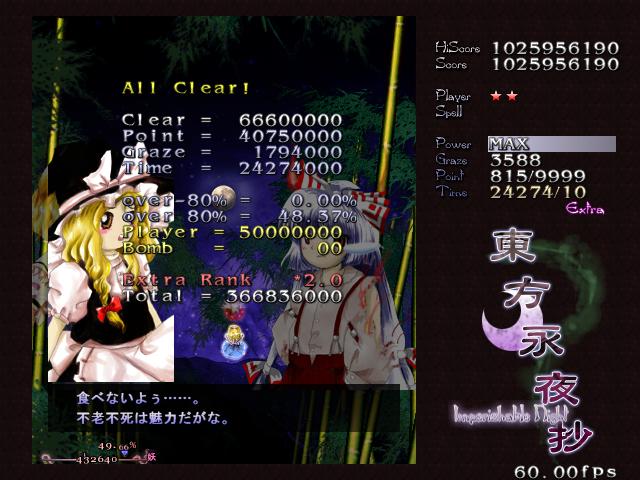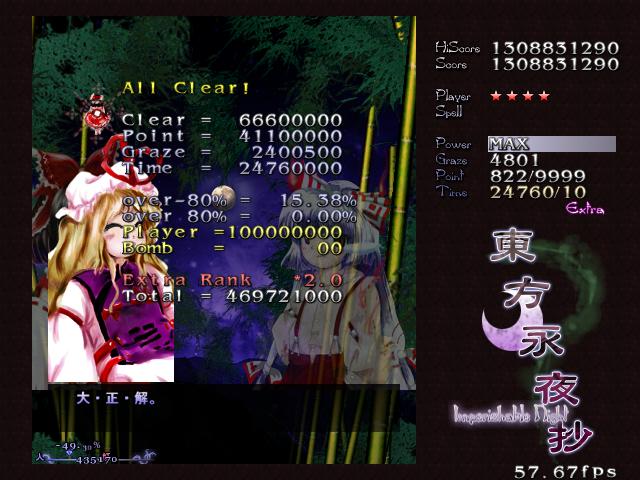 未クリアの単騎全部埋めました。 アリスはやはりマゾかったが、霊夢もなかなか・・・。 紫はチートでした。調子乗ってたらバゼストで2回落ちて残4やっちまった。 レミリアでノーミスフルスペカなんて幻想だった。 ネクスト、インペリ落とし。何故ネクスト落としたし・・・。 |